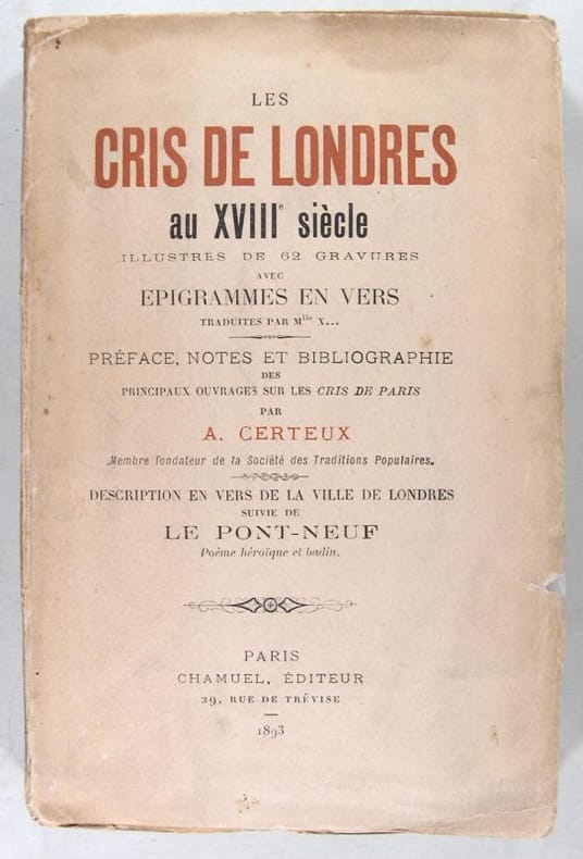 Chamuel éditeur, Paris, 1893. In/8 (20 x 13 cm) broché, couverture imprimée, 62 illustrations in-texte (bois), 183 pages. Préface notes & bibliographie de Certeux des principaux ouvrages sur les cris de Paris, Couverture défraîchie, très bon état des feuillets.