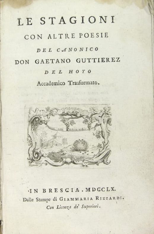 Brescia, Giammaria Rizzardi édition, 1760. In/8 (20 x 13 cm) reliure plein velin du temps, dos lisse à titre manuscrit, 5 planches de Benigno Bossi dont le frontispice, 180 pages. Taches en bordure supérieure de la reliure, ainsi que dans le coin supérieur droit des feuillets. 1ère édition.