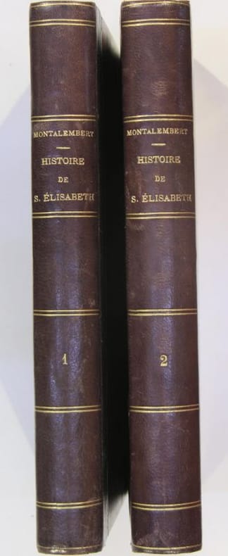 Mention de troisième édition. Montalembert fait précéder sa biographie de la sainte par une longue introduction dans laquelle il évoque sa découverte de l'existence d'Elisabeth de Hongrie, et le contexte politique et religieux dans lequel elle a vécu. Il accompagne son texte d'une précieuse bibliographie et de nombreuses notes de bas de page. S'il fait oeuvre d'historien rigoureux, son livre n'en est pas moins empreint d'une vision un peu romantique et idéalisée du Moyen Age ; il n'a que vingt-cinq ans lorsqu'il en entreprend la rédaction et le livre paraîtra en 1836 et connaîtra un véritable succès.