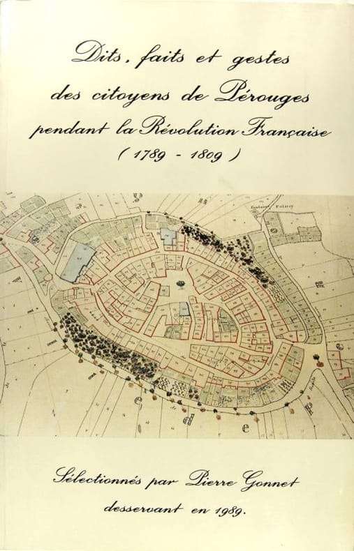 Imprimerie Gatheron Pont de Veyle 1989, In/8 broché (15x24cm), 236 pages, couverture illustrée en couleur plan de Pérouges, dressé par Sarothière en avril 1830. Sélectionnés par Pierre Gonnet desservant en 1989. Dédicace de l'auteur.