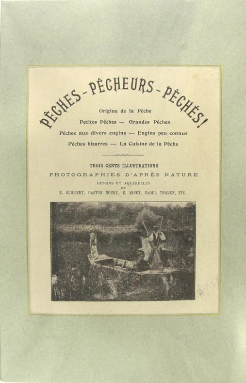 Origine de la pêche. Grandes pêches (perche, brochet, carpe, truite...), petites pêches (ablette, goujon...), pêches bizarres et engins peu connus, la cuisine de la pêche.