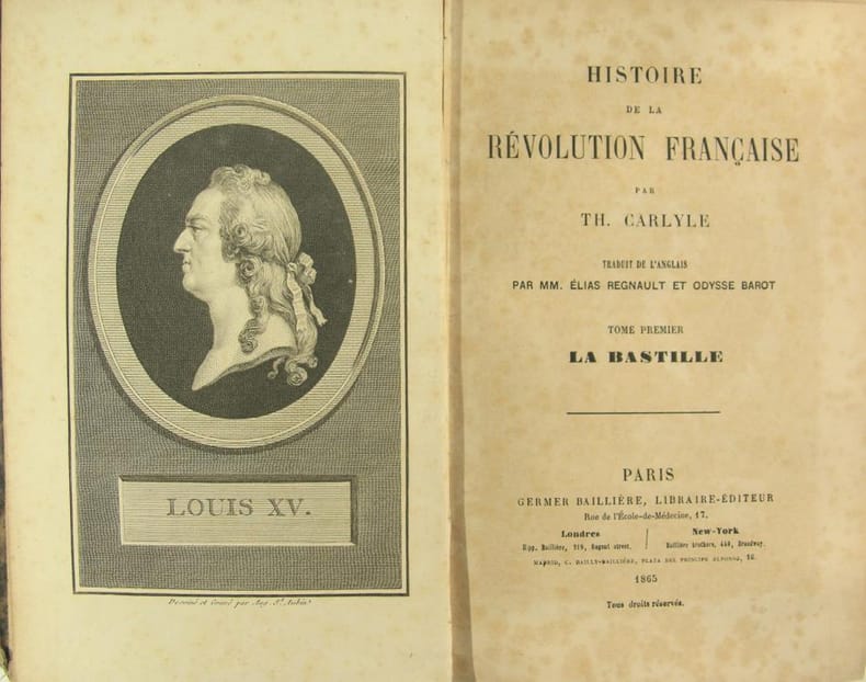 Germer Baillière, Paris. 1865-1867. In/8. Trois volumes relié demi-toile pièce de titre. 381 pages pour le tome I, 403 pages pour le tome II et 427 pages pour le tome III. Traduction de l'anglais par Elias Regnault, Odysse Barot, Jules Roche. Tome I, La Bastille. Tome II, La Constitution. Tome III, La Guillotine.