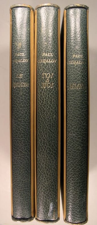 · GERALDY PAULToi et Moi. - Aimer. - Le Prélude. Illustrations de BERTHOLD-MANN.Lausanne, Editions du Bibliophile, mai 1942. 3 volumes, grands in-8°, reliure demi-cuir (dos passées légèrement), tête doré, sous emboitage, intérieur frais, 170, 163 et 157 pp.· Toi et moi : Planche en frontispice en couleurs et 25 charmantes compositions originales en couleurs, dont 1 vignette de couverture répétée sur le titre, 6 hors-texte et 18 dans le texte. Aimer : 19 compositions originales en couleurs, dont 1 vignette de couverture répétée sur le titre, 4 hors-texte et 14 dans le texte. Le Prélude : 20 compositions originales en couleurs, dont 1 vignette de couverture répétée sur le titre, 7 hors-texte et 12 dans le texte.· Un des 200 exemplaires numérotés de 1 à 200 sur papier Vélin teinté Annam, ici le n° 94· · Très bel ensembleLes envois hors de l'union européenne sont payants