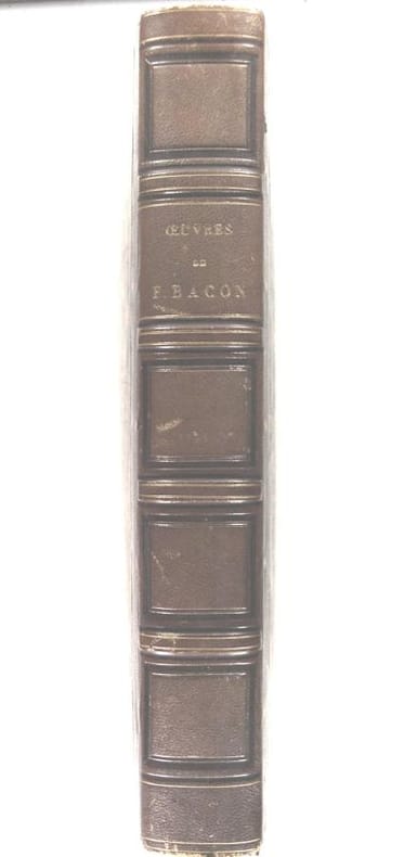Paris Auguste Desrez, imprimeur-éditeur 1838 grand in 8 (28x17) 1 fort volume reliure demi veau vert de l'époque, dos lisse orné d'un riche décor géométrique de filets dorés, XVI et 788 pages, avec un tableau dépliant de " Répartition Universelle des Sciences Humaines ". Texte sur deux colonnes. Collection du Panthéon littéraire. Francis Bacon, Londres 1561 - Highgate 1626, baron de Verulam, vicomte de Saint Alban, Lord Chancelier d'Angleterre, scientifique, philosophe et homme d'Etat anglais. Bon exemplaire ( Photographies sur demande / We can send pictures of this book on simple request )