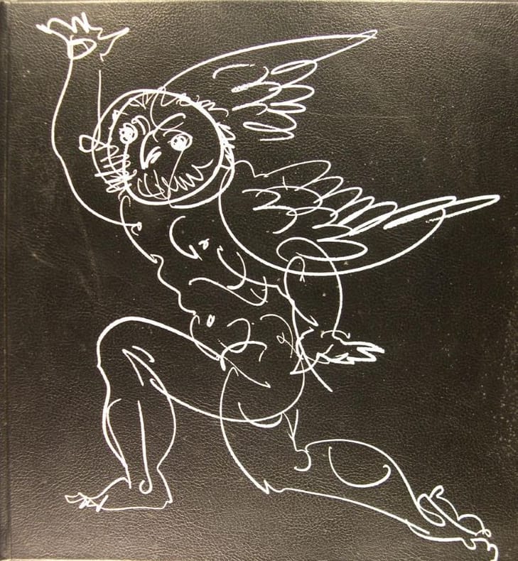 Boesiger,Ernst, Walther Bringolf, Jean Gabus, Hugo Kach, Walter RÃŒegg, K Wolf: Zeitgenossen sehen Hans Erni. Lucerne: Kunstkreis Luzern, 1972. 245 pages. Over 200 colour and black and white illustrations. Front page with an original pencil drawing by Hans Erni of a woman in classical dress sitting on a printing press with mountains and a sun behind her. Signed by the artist and dated 22/10/79 and dedicated 'for Rigby a lithographic reminder'. Includes a loose photograph of Erni and Rigby Graham with a sticker reading 'Customer Original 21'. Cloth. 25x21.5cms. Copy owned by English artist, Rigby Graham. Text in German.