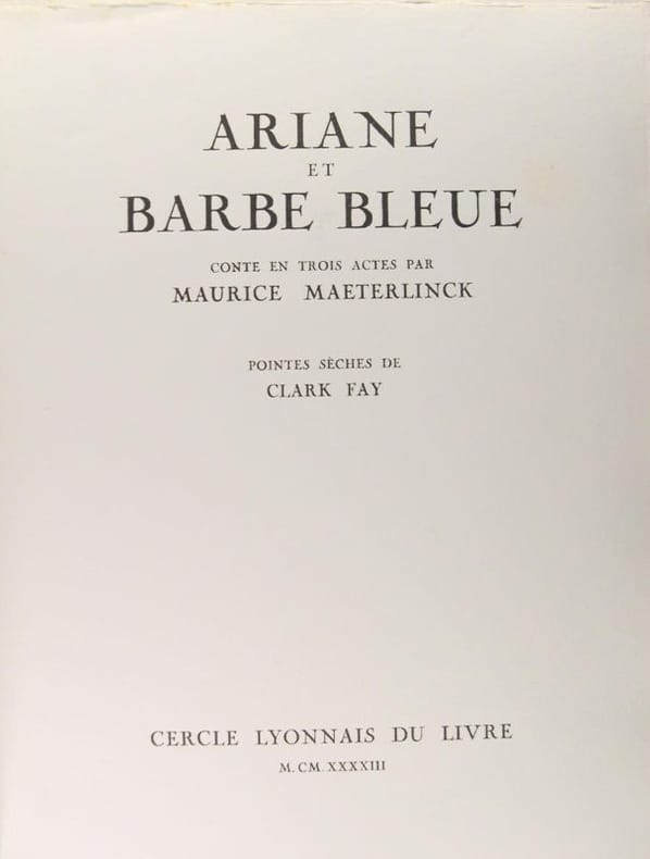 Paris, Cercle Lyonnais du Livre, 1943, in/4 en feuilles sous couverture bleu clair rempliée, chemise étui bleu clair de l'édition, illustré du portrait de Barbe Bleue à pleine page, 43 pointes sèches de Clark Fay, dont 7 hors-texte. Tirage à 130 exemplaires numérotés et nominatifs, notre exemplaire N° 100. Quelques rousseurs. Pointes sèches de Clark Fay.