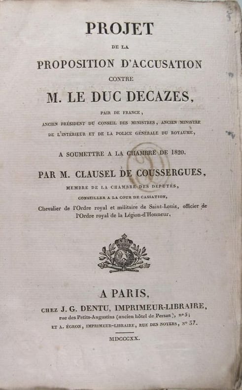 Élie Louis Decazes : 1780 - 1860. Fils du lieutenant particulier de la sénéchaussée et présidial de Libourne et frère de Joseph-Léonard Decazes, Élie Decazes commence des études à l’école militaire de Vendôme de 1790 à 1799. Après ses études militaires, il entame des études de droit, et deviendra en 1805, après son mariage avec la seconde fille du comte Muraire, juge au tribunal civil de la Seine. Il est nommé ensuite conseiller de Louis Bonaparte en 1807, et devient avocat-conseil à la cour de l’appel de Paris en 1811. Il fut en même temps attaché comme conseil au jeune roi du Royaume de Hollande, Louis, et à l’impératrice mère. Immédiatement après la chute de l’Empire, il n’en accueillit pas moins la Restauration avec empressement, refusa de signer une adresse de félicitations à Napoléon Ier après son retour de l’île d'Elbe, se déclarant royaliste, il reste fidèle aux Bourbons pendant les Cent-Jours. Par l’entremise du baron Joseph-Dominique Louis, il peut rencontrer le roi Louis XVIII pendant cette période, qui le récompense pour sa fidélité en le nommant préfet de police de Paris le 7 juillet 1815. Fermeture de la Librairie du 30/12/2025 au 11/01/2026