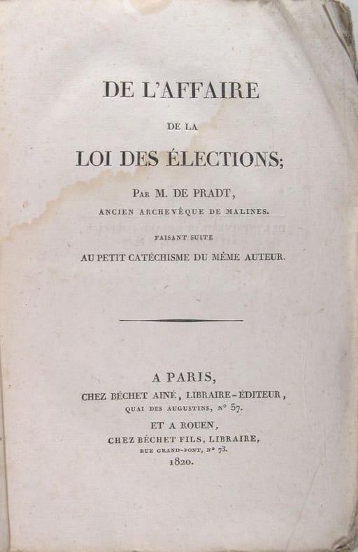 Paris & Rouen, Béchet, 1820, in-8°, cviii + 308 pp, cartonnage d'époque, papiers marbrés, dos étiq. (endomm.), légères mouill. claires sur qq. pages. Pamphletiste infatigable, protégé de Napoléon qui le fît Archêveque de Malines, Ambassadeur à Pologne et Maître des Cérémonies lors du couronnement de l'empereur à Paris.