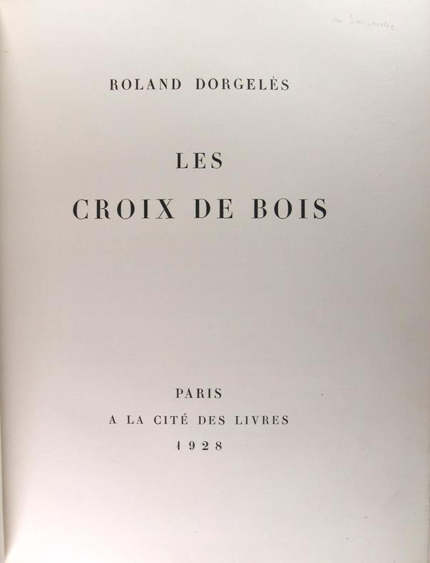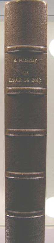 avec un portrait à l'eau forte par G.Gorvel d'après le tableau d’Émile Charmy Édition numéro 1116 sur papier du Marais Les Croix de bois est un roman publié par Roland Dorgelès en 1919 aux Éditions Albin Michel, inspiré de l'expérience vécue par son auteur durant la Première Guerre mondiale, et raconte le quotidien des soldats de l'armée française durant la Première Guerre mondiale. Le long des chemins du front, on trouvait souvent une ligne à perte de vue de croix de bois, faites à la va-vite, et posées au-dessus des cadavres de soldats allemands ou français. Soldats inconnus, jeunes soldats, c’est en leur hommage que Dorgelès écrit ce livre, c’est pour leur souvenir, leur mémoire. vol. relié jolie reliure, 23x15, très bel exemplaire, tranche de tête dorée, 225pp + catalogue, cachet du relieur Maertens, Couvertures d'origines conservées avec dos Édition G. Crès & Cie, 1923 ref/50