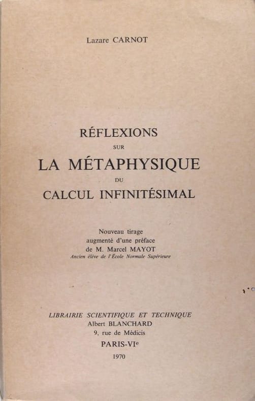 ---- Nouveau tirage augmenté d'une préface de M. Marcel Mayot ---- "Carnot's Reflexions sur la métaphysique du calcul infinitésimal is frankly acknowledged the difficulties that infinitesimal analysis raises for common sense, and although it was received to the reforms initiated by Cauchy, Bolzano and Gauss to put the calculus on a rigorous footing... The genius of the infinitesimal calculus, in Carnot's account, lay in its capacity to compensate in its own procedures for errors that it deliberately admitted into the process of computation for the purpose of facilitating a solution...". (DSB III p. 75)**5969/M7DE
