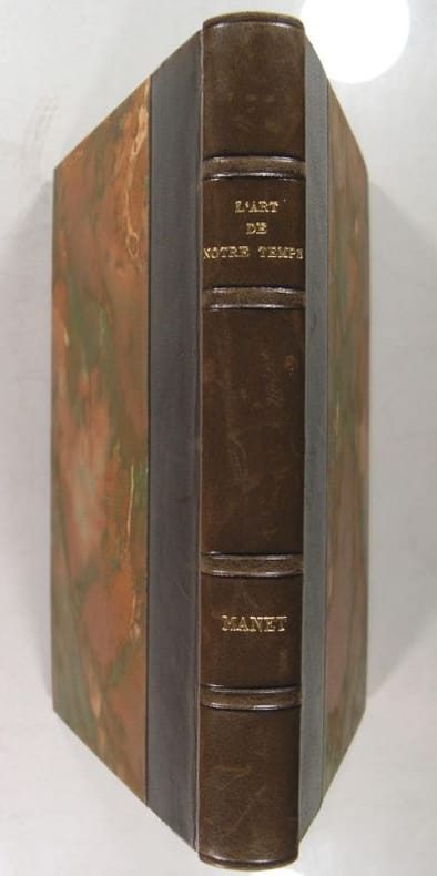 BAZIRE (Edmond). Manet. Paris, A. Quantin, 1884. In-8, édition originale de la première biographie d'Édouard Manet, publiée seulement neuf mois après sa mort, par son ami, Edmond Bazire. Illustrée de nombreuses compositions in-texte, d'un fac-similé d'une lettre de Manet à Madame Guérard, de 3 eaux-fortes de H. Guérard et 6 héliogravures d'après des oeuvres de Manet et de 2 eaux-fortes originales d'Édouard Manet ("L'Odalisque" et "La convalescente") Reliure demi-maroquin marron foncé à coins, dos à 5 nerfs, les caissons ornés d'un fer à la palette de peintre, titre, auteur et date dorés, couvertures conservées, signée L. Feuillet. Belle et rare édition, bien complète des deux superbes eaux-fortes originales de l'artiste, encore plus désirable en reliure signée. (quelques frottements à la reliure, notamment aux nerfs, petite bande de rousseurs en marge de "La femme au carlin" et "Argenteuil")