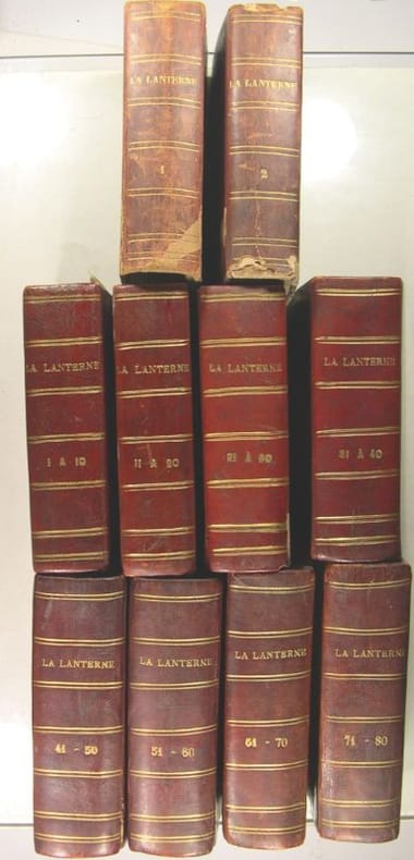 Directeur : Henri Rochefort. Plaquettes in-16 cousues. Environ 60 pages par numéro. La première série comprend 77 numéros, parus du 30 mai 1868 au 20 novembre 1869 ; la seconde comprend 86 numéros, parus du 4 juillet 1874 au 19 février 1876. /// Le plus fameux, satirique et virulent journal d'opposition au Second Empire. Malgré sa clandestinité, la Lanterne connut un immense succès, le tirage de certains numéros dépassant les 100.000 exemplaires.