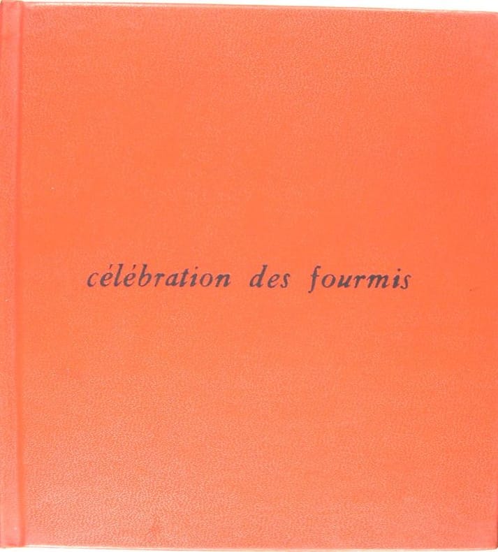 Robert Morel Le Jas du Revest-Saint-Martin. H 1967 BEIGBEDER ( Marc ).Célébration des fourmis.Robert Morel éditeur. Au Jas du Revest-Saint-Martin. Haute-Provence. 1967.Cartonnage éditeur in-12 carré ( 15,5 / 14,5 cm ) plein skivertex rouge. Titre en noir sur dos et 1er plat.Cette célébration est inscrite au catalogue sous le numéro 46.39 pages.Exemplaire Hors Commerce de l'Edition originale. Parfait état. Bandeau conservé.