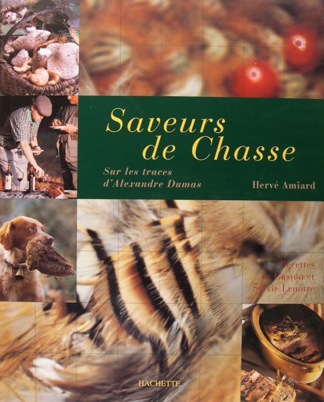 Paris, éd. Hachette, septembre 2000, gd. in-4, cartonnage toilé vert éd., jaquette photos coul. éd., 184 pp., papier glacé, très nb. photos en coul., très nb. reproductions de documents anciens en noir, préface de Gaston Lenôtre, "conseils pratiques", table des matières, Balades dans les plaines et les sous-bois, complicité avec les chiens, arrivée soudaine du gibier, fraternité des repas de chasse... Les photographies d'Hervé Amiard, artiste et lui-même chasseur, nous entraînent dans un univers d'odeurs, de couleurs et de lumière subtil et apaisant. Ces moments d'approche privilégiée de la nature, ces instants d'équilibre et de liberté sont ici saisis dans toute leur essence. Au fil de ces tableaux choisis et sur les traces d'Alexandre Dumas, Gaston Lenôtre, également chasseur et bon vivant, transmet par sa fille Sylvie et son petit-fils Serge Gille-Naves, restaurateur, sa passion du gibier et des volailles festives. Tous les trois aiment ces journées dans la nature où les plaisirs de la table et de l'amitié ont autant d'importance que l'action de chasse et le respect du gibier. Ils proposent 50 recettes originales et savoureuses : Canard sauvage au miel et thym, Râble de lièvre à la moutarde et au cidre, Noix ou filet mignon de chevreuil, sauce orange et gingembre, Daube de sanglier aux aromates frais... autant d'invitations aux plaisirs éternels d'une cuisine conviviale et authentique. Superbes photographies. Très bon état