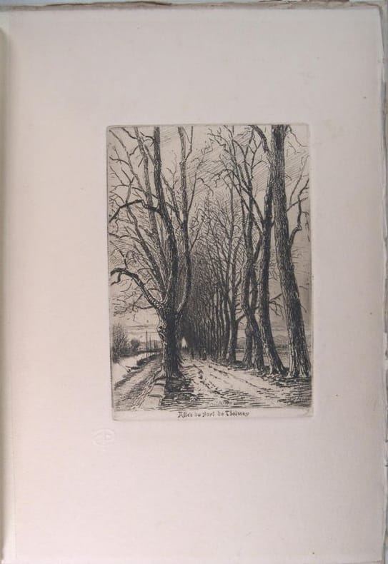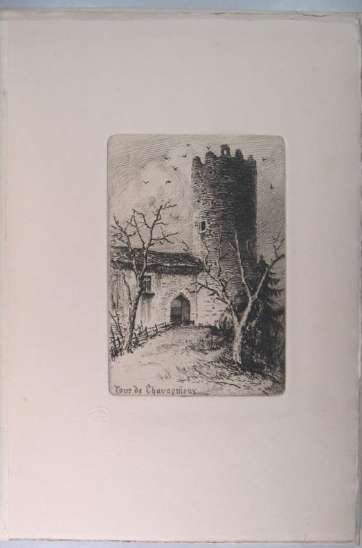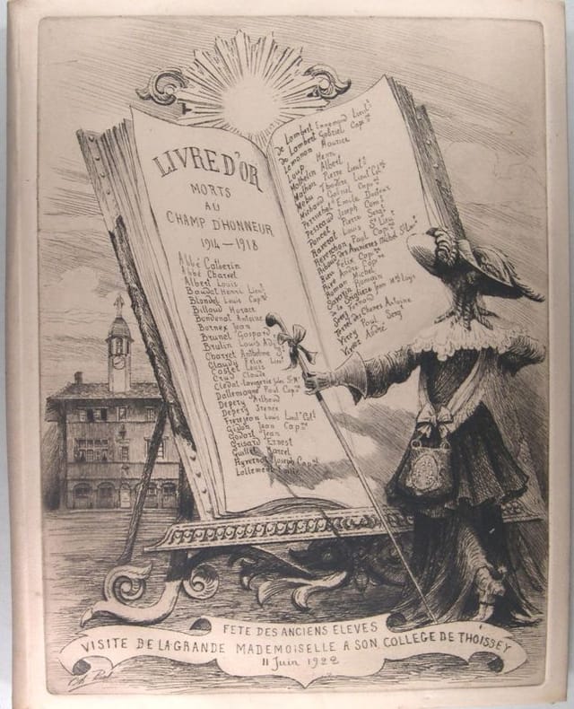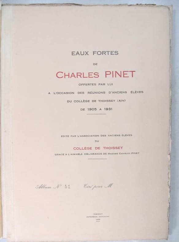 Thoissey imprimerie Marchand 1933, belle album de gravures offert par Charles Pinet à l'occasion des réunions d'anciens élèves du collège de Thoissey. in/4 reliure carton, de l'éditeur recouverte d'une page gravé avec la liste des mort au champ d'honneur en 1914/1918. Album N° 51 avec 19 eaux fortes, (vues de la région de l'Ain..)