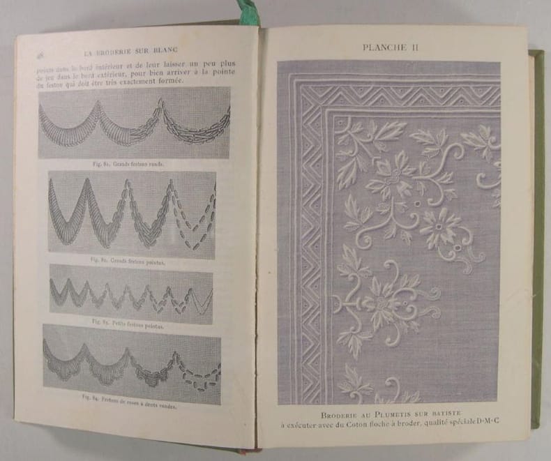 Th. de Dillmont éditeur, D. M. C, sans date vers 1920, in/12 reliure éditeur en pleine percaline verte, 828 pages ; 18 pages références. Illustrations en noir et 13 planches hors texte en couleurs.