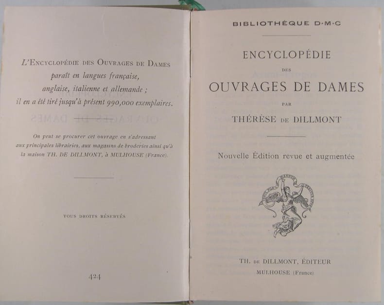 "L'Encyclopédie des Ouvrages de Dames paraît en français, anglais, allemand et espagnol, il en a été tiré jusqu'à présent 1,510,000 exemplaires."Table des Matières,La Couture à la main, la Machine à coudre et à broder, Le Raccommodage, la Broderie sur blanc, la Broderie sur Toile, La Broderie sur Soie et Velours, la Broderie d'Or, La Broderie application, la Tapisserie, le Tricot, le Crochet,La Frivolité, le Macramé, le Filet, les Jours sur Toile, Les Dentelles brodées, les Dentelles à l'Aiguille, les Dentelles aux Fuseaux, La Garniture des Ouvrages, Recommandations diverses, Liste des Articles et Tableaux des Couleurs,des Fils de Coton, de Lin et de Soie, portant la Marque D.M.C. Bibliothèque D.M.C., Liste des Publications illustrées parues à ce jour.