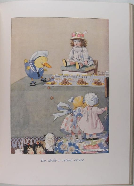 Paris FERNAND NATHAN 1935 un album in-4° (180 x 255mm), 63 pp. Cartonnage éditeur en demi-toile, premier plat orné d'une grande illustration en couleurs contre collée, dos titré en long. (coiffes, coupes et coins légèrement frottés, plats légèrement salis, petite fente en queue de dos, présence de pâles et éparses rousseurs, discrètes marques et petites coupures en bordure inférieure sur quelques pages). Ravissant livre pour enfant comportant des illustrations en noir & blanc dans et hors texte et 8 planches en couleurs par Honor Appleton.