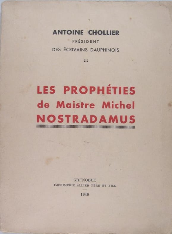 Grenoble 1940, in/8 broché, 54 pages. Conférence faite par Antoine Chollier en 1939 sur les Les prophéties de Maistre Michel Nostradamus.