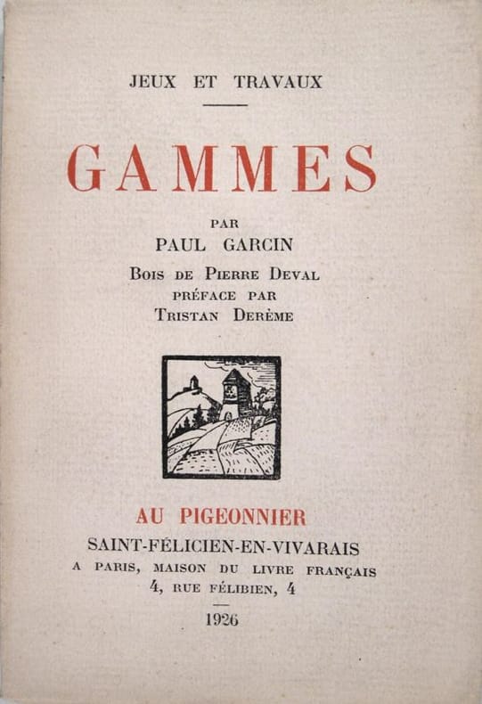 Editions du Pigeonnier, St Félicien en Vivarais, dixième volume de la collection "Jeux et travaux", 1926. In/12 broché, couverture illustrée d’une vignette, 58 pages. Bois de Pierre Deval, préface de Tistan Derème.