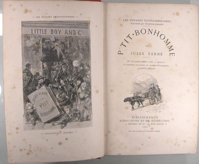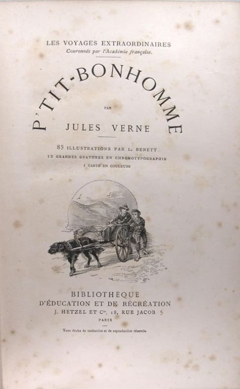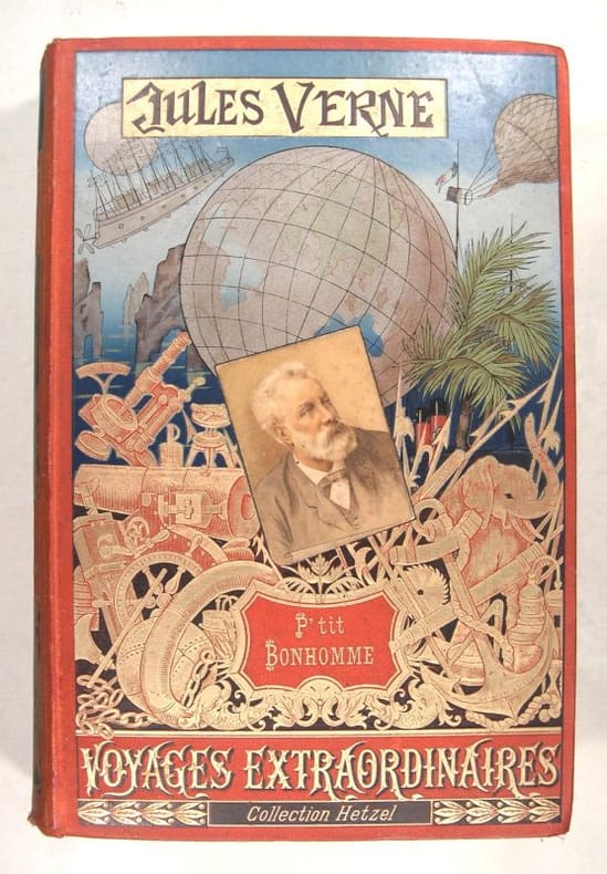 1891-1895, Hetzel, Bibliothèque d'éducation et de récréation, édition originale, in-4 percaline rouge de 460 pages, cartonnage au portrait et dos au phare, tranches dorées, Les voyages extraordinaires - P 'tit-bonhomme, 85 illustrations par L. Bennett, 12 grandes gravures en chromotypogaphie, 1 carte en couleurs | Etat : état moyen, couverture défraîchie, coins et coiffes frottés, rousseurs (Ref.: J12248)