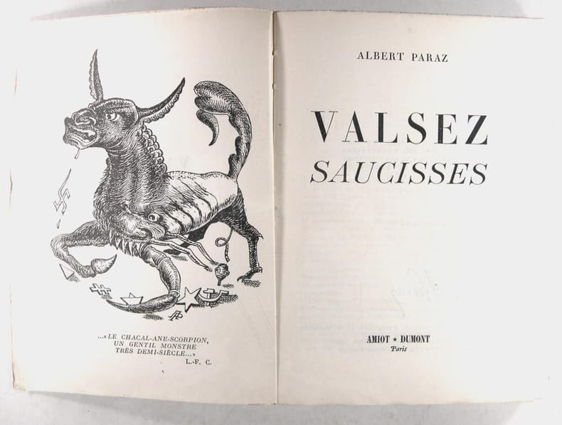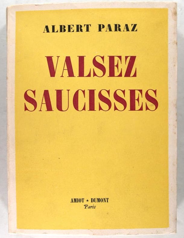 Paris, Amiot Dumont, 1950, in-8, 360 pp, Broché, couverture imprimée jaune, rouge et noir, Édition originale, sur papier d'édition. Frontispice reproduisant un dessin de Paraz, le "chacal-scorpion". Exemplaire enrichi d'un envoi signé de l'auteur sur le faux-titre : "Fais valser les saucisses arabes comme nous faisons à celles de France. Affectueusement". L'ouvrage est à la fois un long journal intime, un recueil de lettres et de pensées et un témoignage sur l'époque; Paraz (1899-1957) l'a conçu comme une défense de Louis-Ferdinand Céline, avec qui il entretint, durant toutes les années d'exil, une copieuse correspondance. Valsez saucisse est le second volet d'un triptyque commencé deux ans auparavant avec le Gala des vaches (1948) et qui s'achèvera avec le Menuet du haricot en 1958. Couverture défraîchie, petites déchirures aux mors. Couverture rigide