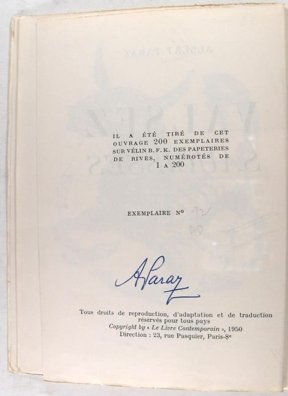Editions Amiot-Dumont 1950. In-8 broché de 360 pages au format 19 x 13,5 cm. Couverture avec titre imprimé. Dos carré. Plats et intérieur frais. Exemplaire non coupé, complet de la rare bande annonce. Dessin de Albert Paraz, représentant le " Chacal-Ane-Scorpion " en frontispice. Défense de Louis-Ferdinand Céline avec de très nombreuses lettres inédites de ce dernier. Valsez saucisse est le deuxième volet d'un triptyque, consacré à la défense de Céline, commencé deux ans auparavant avec le " Gala des vaches " en 1948 et qui s'achèvera avec " le Menuet du haricot " en 1958. Un des 200 exemplaires numérotés sur Vélin B.F.K de Rives, du tirage de tête, signés par Albert Paraz ( n° 129 ). Seul grand papier. Rare, surtout dans un tel état général de fraicheur, proche du parfait. Edition originale.