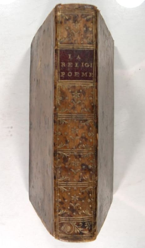 A Paris chez Desaint & Saillant 1763. huitième édition, in/12, reliure de l'époque, dos lisse, orné, pièce de titre en maroquin rouge. Ouvrage en deux parties, XXIV préface ; 328 pages pour : La religion, Poëme.; 143 pages pour : La grace poëme.