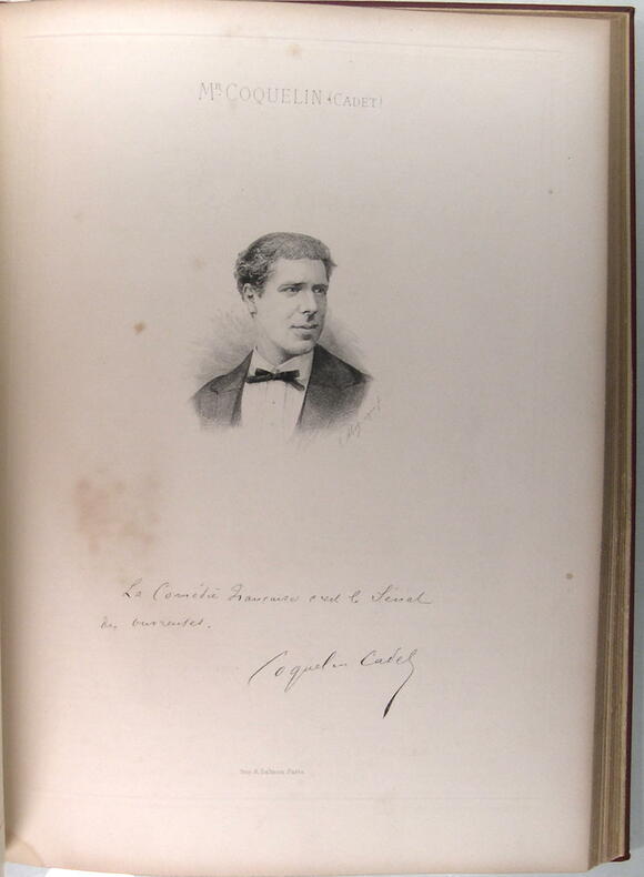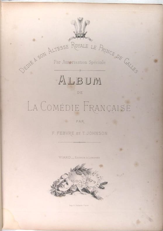 Viard éditeur, Londres, 1879, in folio, reluire pleine toile bordeaux postérieure, pièce de titre. Album dédié à son Altesse Royale le Prince de Galles, par autorisation Spéciale, 1680-1879. Texte en anglais et en français. XXXVII pages ; 56 pages. 1 frontispice et 21 portraits. Coquelin cadet, Sarah Bernhardt, Emilie Broisat, ...
