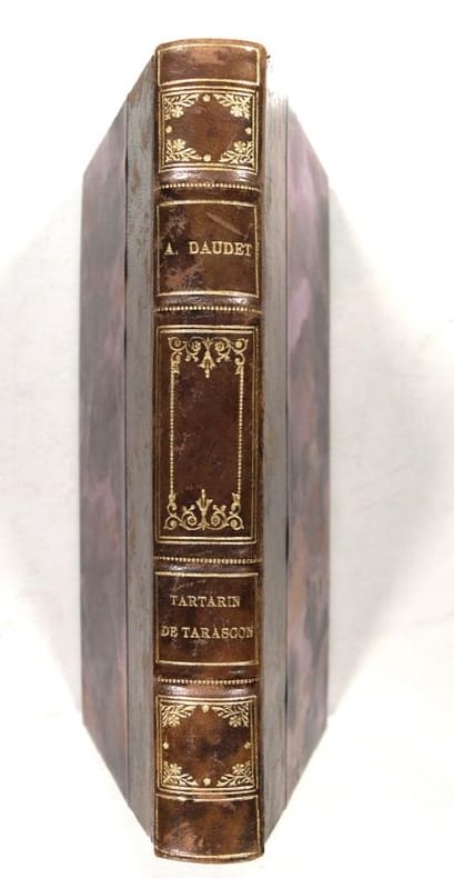 PARIS. 1885-1887-1890. 3 VOLUMES IN-8 (16,5 X 23 X 10 CENTIMETRES ENVIRON), DANS UNE RELIURE UNIFORME D’EPOQUE 1/2 CHAGRIN ROUGE, DOS A QUATRE NERFS ORNE DE CAISSONS A FLEURONS DORES, TITRE DORE, PLATS RECOUVERTS DE PERCALINE ROUGE ENCADREE DE FILETS A FROID. CONTIENT :- AVENTURES PRODIGIEUSES DE TARTARIN DE TARASCON. PARIS. E. DENTU, EDITEUR. 1887. (4) + 282 ET (1) PAGES. ILLUSTRE DE NOMBREUSES COMPOSITIONS IN ET HORS TEXTE PAR JEANNIOT. PREMIER TIRAGE (VICAIRE. III. 39-40).- TARTARIN SUR LES ALPES, NOUVEAUX EXPLOITS DU HEROS TARASCONNAIS. ILLUSTRE D’AQUARELLES PAR ARANDA, DE BEAUMONT, MONTENARD, DE MYRBACH, ROSSI. GRAVURE DE GUILLAUME FRERES. PARIS. CALMANN-LEVY. EDITION DU FIGARO. 1885. (4) + 334 ET (5) PAGES. ILLUSTRE DE 16 AQUARELLES HORS TEXTE ET DE NOMBREUSES COMPOSITIONS EN NOIR DANS LE TEXTE. SECOND TIRAGE, PARU LA MEME ANNEE QUE L’EDITION ORIGINALE. (VICAIRE. III. 57-58).- PORT-TARASCON. DERNIERES AVENTURES DE L’ILLUSTRE TARTARIN. DESSINS DE BIELER, CONCONI, MONTEGUT, MONTENARD, MYRBACH ET ROSSI. PARIS. E. DENTU, EDITEUR. DE LA COLLECTION GUILLAUME (EDITION DU FIGARO). 1890. (8) + 392 PAGES. EDITION ORIGINALE (VICAIRE. III. 61).BEL ENSEMBLE.