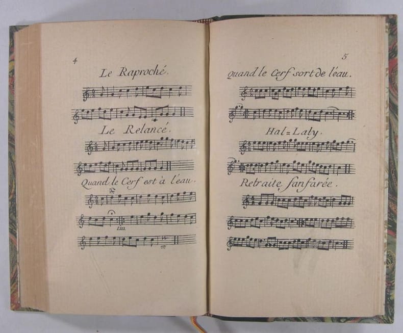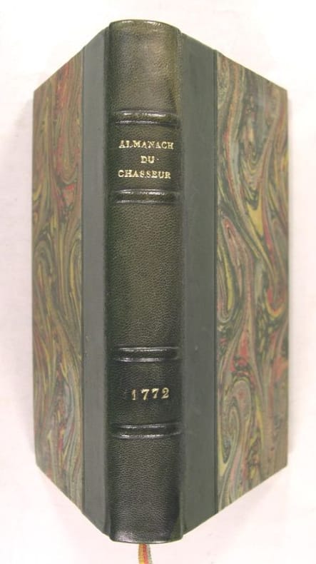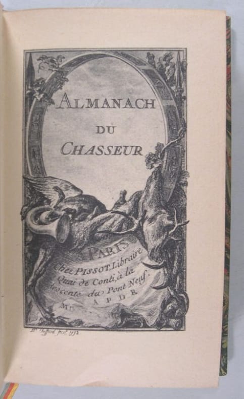 A Paris, chez Pissot libraire, 1772, réédition par le Saint Hubert Club de France en 1951. In/12 reliure postérieure en demi-basane verte, dos à nerfs à titres dorés, page de titre par Choffard 1772, 1 f.,préface de Charles Radot, 3 f., n.ch., 207 pages de texte et 37 de fanfares de chasse.