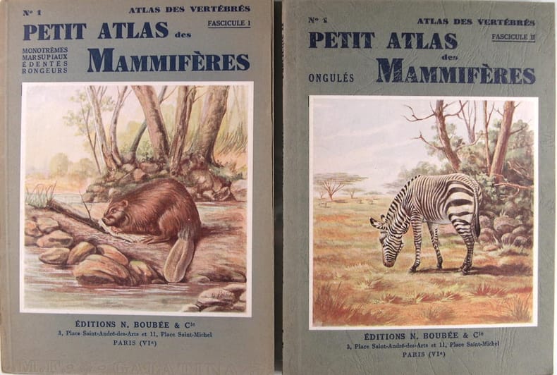 Editions N. Boubée, Paris, 1946. 2 fascicules in/12 broché, couvertures illustrées de vignettes couleurs, illustrations : planches couleurs. Fascicule 1 : monotrèmes, marsupiaux, édentés, rongeurs 84 pages de texte et 12 planches en couleurs - Fascicules 2 : ongulés, 77 pages de texte et 12 planches en couleurs.