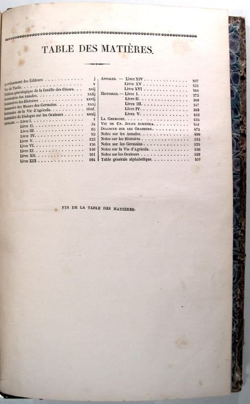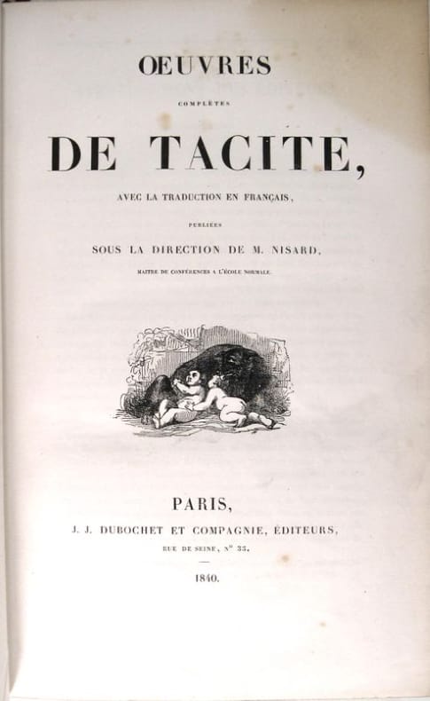 Paris, J. J. Dubochet et compagnie, éditeurs 1810, collection des auteurs Latins avec la traduction en français, publiés sous la direction de M. Nisard. In/4 reliure en demi-basane bleu, dos lisse orné romantique, haut de coiffe manquante. 565 page, texte sur deux colonnes. In fine notes sur les annales, notes sur les histoires, notes sur les Germains, notes sur la vie d'Agricola, notes du dialogue sur les orateurs, enfin table générale alphabétique.