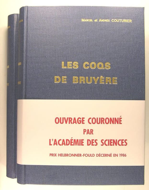 Ouvrage partiellement écrit par le Docteur Couturier (7 chapitres) puis poursuivi à sa mort par son épouse grâce à de nombreux dossiers contenant notes, courriers, rapports annotés, réflexions... Cette monographie contient donc tout ce que l’on désire savoir sur le coq de bruyère. Histoire naturelle - Moeurs - Chasse. Enrichi de nombreuses illustrations : en couleurs ou en noir, radiographies, tableaux de mensurations, index bibliographique et bibliographie de la page 1309 à 1516. Ouvrage couronné par l’Académie des Sciences en 1986.