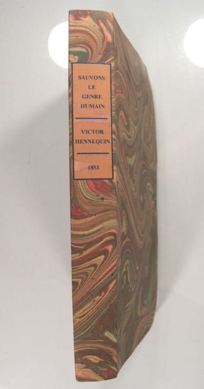 LE MANIFESTE D'UN "FOU EXCEPTIONNEL, UN FOU DE SANG RASSIS" Édition originale, sans mention d'édition, avec les couvertures conservées et la présence de témoins en gouttière et en queue, du manifeste d'un « fou littéraire ». On trouve des exemplaires à la même date portant les mentions de deuxième et troisième édition. Avocat et homme politique, Victor Hennequin (1816-1854), contributeur de la Démocratie pacifique, défendit tout au long de sa carrière la possibilité d'une alliance entre l'Église catholique et le socialisme. Il fut brièvement emprisonné pour avoir participé à une protestation contre le coup d'état de 1851. Quelques années avant sa mort, il publia deux ouvrages au contenu fantaisiste qui lui valurent le qualificatif de « fou littéraire », Religion et Sauvons le genre humain. Brunet évoque l'écrivain en ces termes : « Hennequin a réellement présenté le phénomène singulier d'une intelligence moitié aliénée, moitié maîtresse d'elle-même ; il a été un fou exceptionnel, un fou de sang rassis » (Fous littéraires, p. 96). Il ajoute : « On le voyait dans les rues, écrivant de son doigt sur la vague de l'air ; il prétendait que de cette écriture résultaient des caractères très visibles pour lui. Il affirmait avoir sur la tête une trompe aromale par laquelle les âmes répandues dans l'espace lui faisaient des communications. » Guillaume Cuchet décrit quant à lui Hennequin comme un des cas « les plus extrêmes et les plus pathétiques » d'un mouvement de dépolitisation des théoriciens religieux qui les mènent, au lendemain des révoltuions de 1848 et 1851, à se replier sur la spéculation ésotérique. (« Des insurgés et des initiés. Ésotérismes et révolution en 1848 », Politica hermetica, n. 31, 2017, p.71-87.) Fervent adepte des théories de Charles Fourier, dont il exagère ou transforme certaines idées, Victor Hennequin expose dans Sauvons le genre humain le détail de sa cosmologie, dont il explique, dans une lettre à Napoléon III placée en préface, qu'elle lui a été dictée par l'esprit de la Terre communiquant avec lui par l'intermédiaire d'une table tournante : « Je ne me suis jamais rallié à votre gouvernement. Je vous écris avec l'espoir que vous me lirez jusqu'au bout. Je ne vous demande ni place, ni croix, ni argent, ni faveur d'aucune espèce. Vous avez entendu parler des tables tournantes. J'ai poussé ce phénomène à ses dernières limites, et le mouvement de la table s'est changé en voix qui m'a inspiré ou dicté tout un livre. » (pp xxvii-xxviii) En 1854, Émile Bertrand fit bravement paraître chez Garnier frères une réfutation de l'ouvrage intitulée Sauvons le genre humain ! à M. Victor Hennequin, critique et réfutation. PROVENANCE : Edgar Depitre (1881-1914), ex-libris gravé contrecollé au contreplat supérieur et initiales "E. D" en pied du dos. Historien de l'économie, mort au combat lors de la bataille des Flandres. Quelques frottements, rares rousseurs.