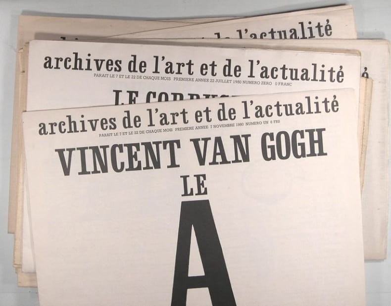 Revue Robert Morel 12 numéros, format journal; 46 x 32,cm. Illustrations en noir, l'illustration centrale à double page. 1980 2 N° : Le Corbusier, numéros gratuit hors commerce ; Vincent Van Gogh, 22 juillet, 7 novembre - 1986 6 N° : 22 juillet : Pierre Chapo, 22 août : Lucien David, 22 septembre : Le Facteur Cheval, 22 octobre : Albert Dürer, 22 novembre : Nostradamus, 22 décembre : François d'Assise - 1987 4 N° : 22 janvier : André Richaud, 22 février : Michel Seuphor, 22 mars Testu, 22 mai : Louis Pons.