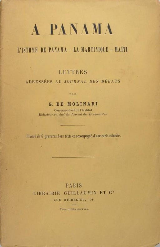 Paris Librairie Guillaumin et Cie, sans date (1886) 1886 in 12 (18,5x11,5) 1 volume broché, couverture illustrée (défraichie, petite restauration dans l'angle inférieur, dos fendillé), XI et 324 pages [2], avec 6 gravures hors-texte et une carte dépliante en couleurs (annotations manuscrites à caractère technique), quelques rousseurs. Notre exemplaire est enrichi d'une grande carte en couleurs dépliante: Compagnie universelle du canal intérocéanique de Panama, tracé du canal et situation des travaux en cours d'exécution au 1er juin 1885, et profil (annotations manuscrites à caractère technique). Bon exemplaire ( Photographies sur demande / We can send pictures of this book on simple request )