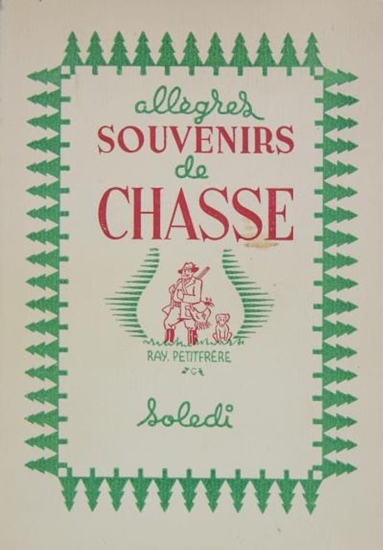Ou badines historiettes destinées au sain divertissement de ceux qui, étant chasseurs, ne se laissent à juste titre endolorir par aucune affliction... et de ceux qui, ne l'étant pas, se sentent, avec raison, lamentablement éplorés... Avec 9 planches dessinées par l'auteur. Liège. Soledi. 1946. In-8 (153 x 217mm) broché, couverture imprimée et illustrée en rouge et en vert, 190, (1) pages. Bon exemplaire.