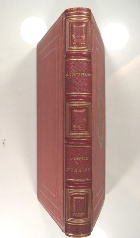 Paris, Félix Alcan, Editeur, 1886, Huitième édition. In/8, dos en chagrin rouge à nerfs, plats de percaline rouge ornée sur le premier d’un fer de lycée doré, 2 ff. n. ch., 368 pages. 1° - Unité de l’espèce humaine. 2° - Origine de l’espèce humaine. 3° - Antiquité de l’espèce humaine. 4° - Cantonnement primitif de l’espèce humaine. 5° - Peuplement du globe. 6° - Acclimatation de l’espèce humaine. 7° - Homme primitif - Formation des races humaines. 8° - Races humaines fossiles. 9° - Races actuelles ; caractères physiques. 10° - Caractères psychologiques de l’espèce humaine.