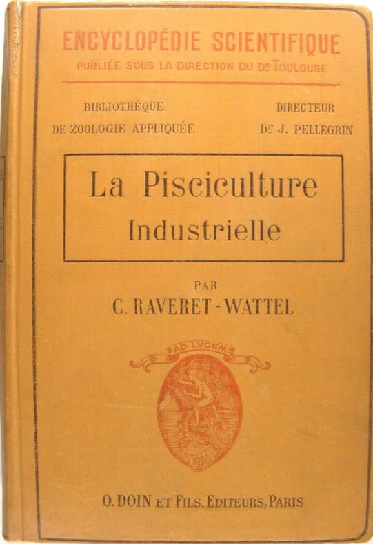 Paris, Octave Doin, 1914; in-12, percaline ocre de l’éditeur. 408 pp., 3pp. de catalogue. 74 gravures et photos in-texte. "Manuel très complet; l’élevage des salmonidés en bassin (truite, saumon de fontaine, omble.) La deuxième partie traite de la réalisation et de l’exploitation d’étangs. Une troisième partie sur les questions sanitaires et en appendice l’élevage des écrevisses. Inconnu de Dean qui cite pourtant tous les autres livres de cet auteur. "