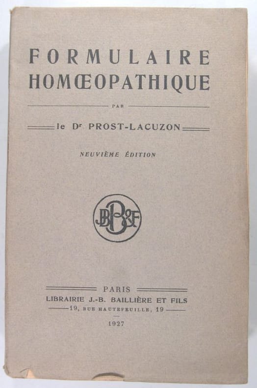 Prost-Lacuzon (1817-1899). Né à Dole en 1817. Médecin et romancier. Membre de la société d’Émulation du Jura et membre correspondant de la Société médicale homéopathique de France (en 1865). Ce livre se présente comme une liste des maladies, données dans la table alphabétique en fin de volume, avec en regard les remèdes homéopathiques correspondants. Comme le dit l'auteur dans son Introduction : "Ce livre, dont les formules sont le fruit d'expérimentations particulières, d'observations prises au lit des malades, et d'emprunts faits aux meilleurs auteurs, a été écrit dans le but de propager la seule et vraie méthode de guérir rapidement, doucement et sûrement les malades." table ( extraits), fièvres - maladies par excès de sang - angine - Diarrhée - convulsion - dent - perversion de la vue - animaux parasites - névrose - organes sexuels de la femme - infection de la peau - choléra - scofules - paralysies.. Très bel exemplaire, vol fort in8, 19x12, demi cuir, bel état intérieur, 584pp. Paris, Baillère & fils, 1872 ref/c96
