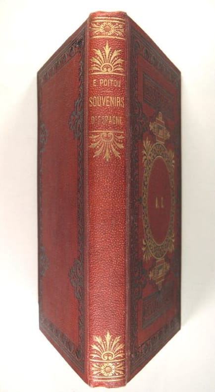 L'ouvrage s'agrémente de nombreuses compositions in et hors-texte de Valentin Foulquier. Lequel fut ''élève d'Abel de Pujol, et qui acquit une considérable réputation principalement au travers de ses illustrations'' (in Bénézit). Table : Pays basque - Pampelune - Saragosse - Séville - L'Alcazar - Baylen - Andujar - Cordoue - Andalousie - Xerès de la Fronterna - Cadix - Gibraltar - malaga - Grenade - Alicante - Murcie - La Huerta - Aranjuez - Tolède - Madrid. Absent de Foulché-Delbosc, Bibliographie des voyages en Espagne et en Portugal - Bénézit IV, Dictionnaire des peintres, p. 458 - Osterwalder I, Dictionnaire des illustrateurs, p. 383. Angles élimés. Quelques abrasion affectant la reliure ; laquelle présente en outre un éclat légèrement altéré. Quelques claires rousseurs dans le texte. Les trois derniers feuillets ainsi que le dernier plat de la couverture papier originelle sont légèrement effrangés. Du reste, bonne condition.