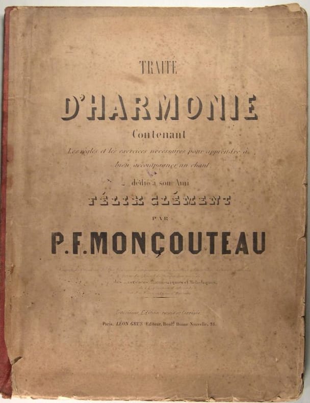 Paris, Léon Grus, troisième édition revue et corrigé, sans date vers 1870, 66 pages, partition gravée, In folio, couverture abîmée. Table des matières : l'accord parfait majeur, mineur, et de quinte diminuée - des renversements de l'accord - de la septième de dominante - de la manière d'accompagner une basse donnée, et de la modulation, ...