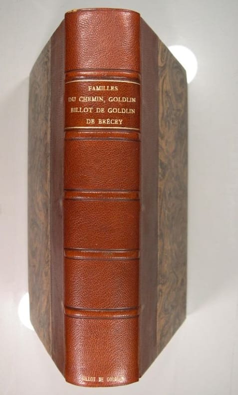 Recueil de 5 publications, in/8, reliure en demi-chagrin bordeaux, (avec parfois des notes manuscrites). Göldi, Göldli, Göldlin, 1902, par Prof. Dr. Phil. Emil August Göldi, texte en allemand, illustrations en noir - J.-G.S. Billot de Goldlin Famille d'Arc - Essai généalogique sur la famille Du Chemin seigneurs de la Tour, la Vaucelle, Mesnil-Durand et autres lieux et sur la famille de Villebresme. Nancy A. Crépin-Leblond 1905, in/8 broché, 90 pages. Illustrations en noir. Exemplaire sur papier Japon N° 3/8 - Capitaine Billot : Notes de guerre du 4me régiment de cuirassiers, 1913, chez Honoré Champion, 101 pages - Victor Brunet, chez Condé-sur-Noireau, 1890 : A travers l'Avranchin, Brécey, les Brécey, les d'Amphernet, les de Vassy. Notice historique, 144 pages.