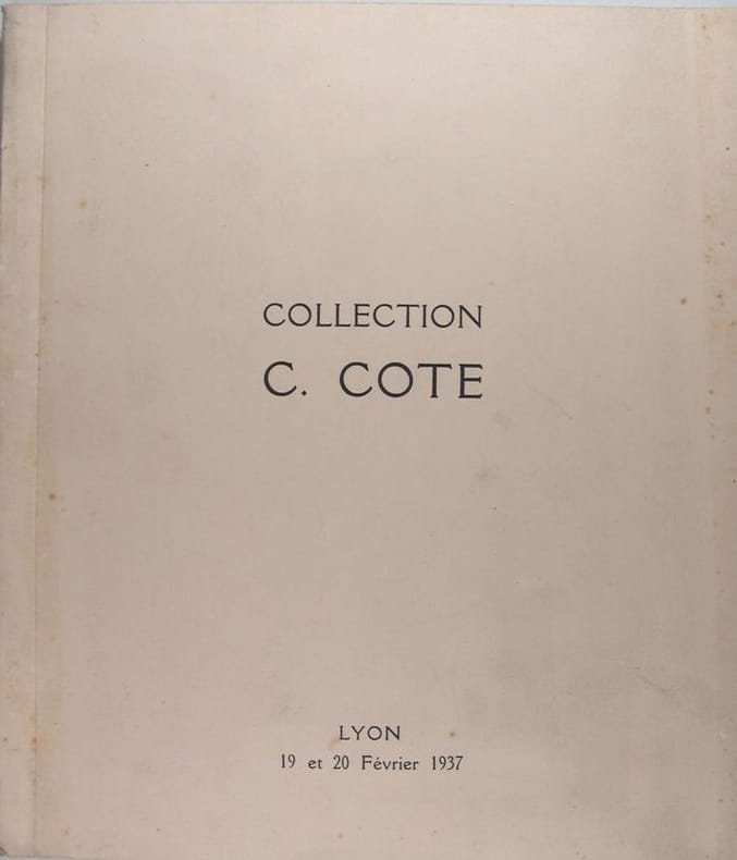 Catalogue Lyon 19 et 20 février 1937, Collection C. Cote In/4 broché, 23 pages, 287 lots. Illustrations en noir et blanc hors texte. Diplômes et décorations françaises, gravures Lyonnaises, chartes de mariage, très beaux meubles du XVIIIé siècle signé - Miniatures du XVIIIém siècle : antiques, faïences Persanes, Hispano, Rhodes, Italie, Précolombiennes - Verreries de Emile Gallé, de Nancy,...