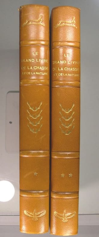 1953, Union Européenne d'éditions, deux volumes in-4 mi-cuir bordeaux de 231 et 223 pages, couverture marbrée rouge, rose et mauve, titrage et calligraphie dorés sur dos, nombreuses illustrations noir et blanc hors et in-texte, Le grand livre de la chasse et de la nature, deux volumes, le volume I comprend: l'animal sauvage, zoologie, le chien de chasse, tir de chasse, le volume II comprend: la chasse, organisation de la chasse, trophées, protection de la nature, de diverses questions cynégétiques, la chasse dans l'art et dans la légende | Etat : Bon état général, cuir sur le dos usé, coins et coiffes frottés, (Ref.: G2945)