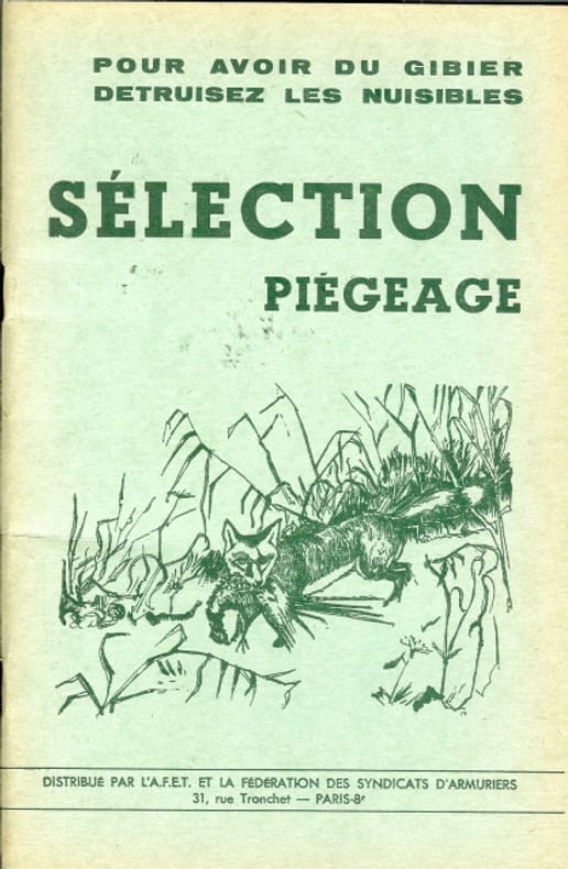 Plaquette sur la destruction des nuisibles distribuée par la fédération des syndicats d’armuriers. Avec un calendrier du piégeage. Figures en noir dans le texte. Pièges, comment détruire les belettes et les herminettes, piégeage, destruction des fauves, loutre, fouine, martre, putois, assommoirs, les oiseaux de proie et le grand duc, quelques trucs, oeufs au phosphore, le repeuplement des chasses, comment élever des perdreaux à l’état naturel, élevage du faisan.