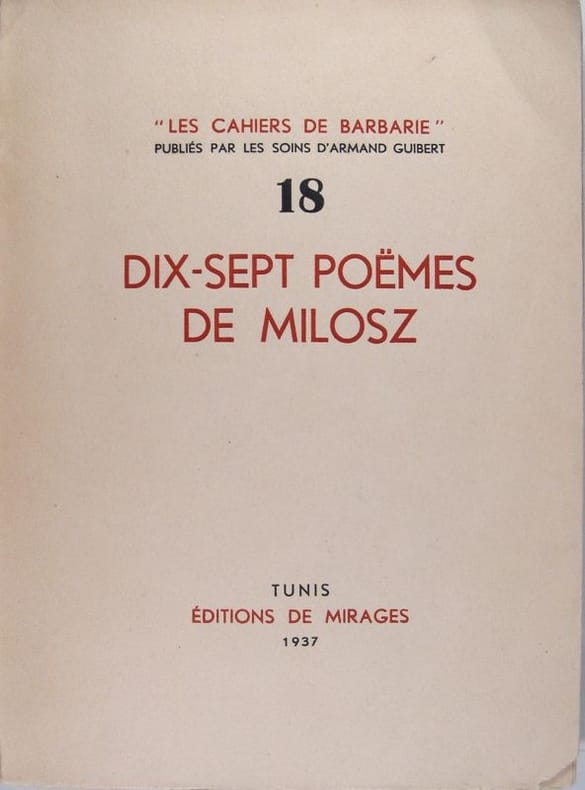 Tunis, éditions de Mirages, 8 mars 1937, "Les cahiers de Barbarie", 18, publiés par les soins d'Armand Guibert, petit in/8 broché, (14x19 cm), il manque un coin de la couverture, 89 pages. Un des 315 exemplaires sur alfa satiné N° 241.