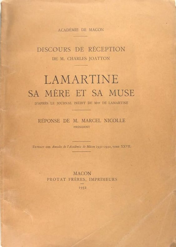 Mâcon Protat Frères imprimeurs 1932, plaquette grand in/8 broché, 56 pages. Discours de réception de M. Charles Joatton, réponse de Marcel Nicolle. Extrait des Annales de l'Académie de Mâcon 1931-1932, Tome XXVII. Dédicace de l'auteur.