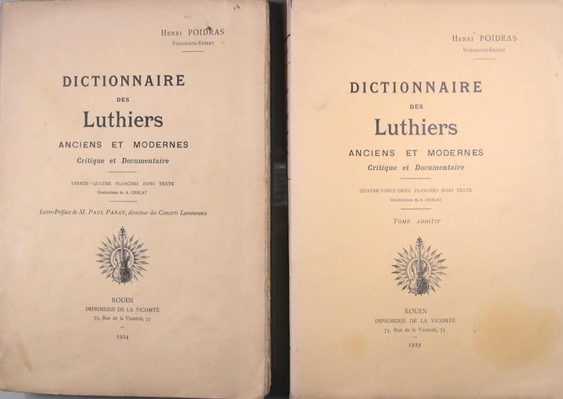 Rouen, Imprimeur de la Vicomté, 1924. 2 Grands In/8 broché, couverture imprimée. XIV pp., 233 pages, 1 f. de table. Ouvrage illustré par A. Chalat, gravure en frontispice qui représente Stradivarius dans son atelier et de 34 planches h.-texte sur papier couché. A la fin du volume 16 planches de facs-similés et libellés d’étiquettes, recto-verso h.-texte sur papier couché et une Bibliographie des ouvrages sur la lutherie / Tome additif 280 pages, 82 planches hors texte de A. Chalat.